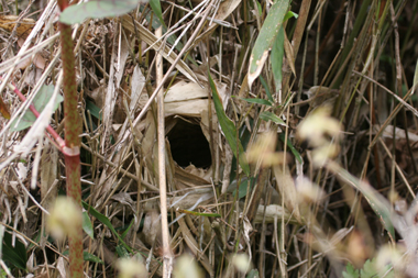 畑と林の境でウグイスの巣を見つけました。メスが巣から飛び出したので、その後、近づかずにいたのですか、5月13日、巣立ちが終わったことを確認しました。 よかったです。