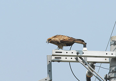 「ピーヒョロロロ」とトビの鳴き声。その方向を見ると遠くの電柱にトビがとまっている。 近づいて行くと若鳥のようで度々鳴いている。まだ完全に親離れしていない幼鳥なのか? 30分以上同じところにとまっていたがようやく旋回しながら飛び去った。