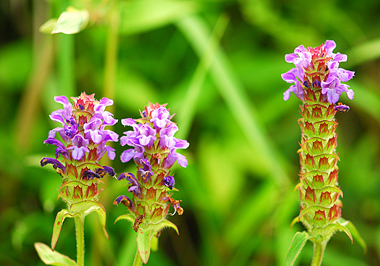畦の草刈がなされた後、最も目立って出てくるのはウツボグサ。紫色の鮮やかな花を付けている花穂が遠くからでもよく目立つ。 花には蜂が吸蜜に訪れている。ほとんどの蜂は花の前から蜜を吸うが、クマバチは花の根元を外から噛んで直接蜜を吸っている。