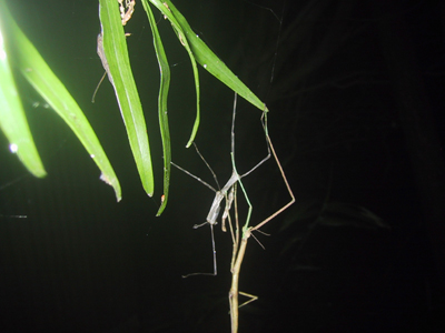 雨の夜、畑の木の枝で、脱皮しているナナフシを見つけました。脱皮を終えたばかりで、白っぽい色をしていましたが、翌朝、どこかへ移動したのかいなくなっていました。