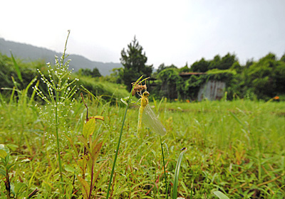 先月ハラビロトンボの羽化が行われていた休耕田で、この日はアキアカネ、ヒメアカネ、そしてこのマユタテアカネの羽化が行われるという賑やかさ。 これから暑い夏を迎えるところだが、もう秋の序奏が始まっているのである。