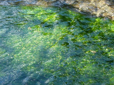醒ヶ井の地蔵川に自生するバイカモ、今年は水量が多いので流れの中に沈んで見え た。 水温15度前後の清流にしか育たないそうなので、その自然環境が保持されている証し となる。