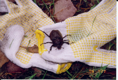 公園づくりの一環として、樹木の剪定中にメスのカブトムシが飛び出してきた。 先般ここで多くのカブトムシに出会ったが、その一部が成虫に成長したものと思われる。