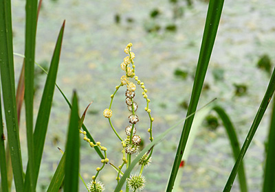 トンボが多く生息する溜池にミクリの花が今や盛りと咲いている。春から夏にかけてこのミクリの葉で羽化したトンボは数え切れない。 希少種となったミクリはここでは健在。
