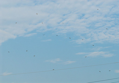 他のトンボがまだ活動していない早朝からウスバキトンボは田畑の上で群で飛んでいる。中には交尾や産卵を行っているものもいる。
