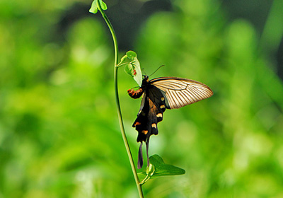 ジャコウアゲハの雌が草むらの上スレスレをふわふわと飛んでいる。産卵する食草のウマノスズクサを探しているのだが、ここにはほんの少ししか生えていないのでなかなか産む事が出来ない。 見ているといろんな草にとまっているので、どうも食草を眼で確認しているのでなくウマノスズクサの匂いを確認しているように思える。