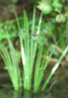 胸が緑色の金属光沢をしたタカネトンボ、畑の上空と池の両方で飛行していた。池の上ではゆっくり前進してホバリングし、また少し前進してホバリングするといったタカネトンボ特有の飛行。これが終わると今度は畑の上で飛行しているが見ていると昆虫をとっているので摂食飛翔のようだ。