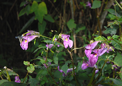 ここのツリフネソウ、薄暗い湿ったところに咲いているので他の場所と比べると開花時期が遅いように思う。 しかも今回は夏の草刈で開花直前の蕾が多く失われ、その後花芽が成長していったものだから、例年より最盛期が遅くなったようだ。