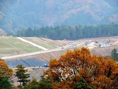 美しく黄葉したコナラと遠景の緑の木々にはさまれた無残に削り取られた山肌、その 対比が鮮やかなだけに壊された自然の姿が生々しい。 これは現在箕面の山奥で進行中の 「水と緑の健康都市」開発現場で、重機がうなり、人間の破壊力のすさまじさを示している。