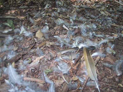 雑木林の中でトラツグミの羽が散乱しているのを見つけました。羽には猛禽にやられた痕跡はなく、ここで見られるキツネ、タヌキ、ネコのいずれかではないかと思われます。