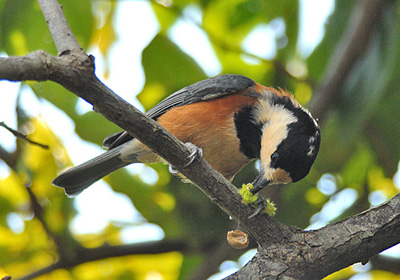 エゴノキの果実を採っていたその反対側の柿木でも、ヤマガラがイラガの幼虫イラムシを捕って食べていた。 昔子供の頃このイラムシに刺され痛くて泣いたのを思い出した(私の田舎ではこの虫をオイラと呼んでいた)。 でもヤマガラは刺がいっぱいあるこのイラムシを足で押さえ難なく突っついて食べている。