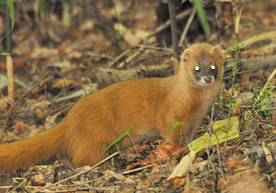 野鳥を追って雑木林に入るとイタチが横切った。こちらの姿に驚いてじっと見ているので写真を撮ったがそれでも逃げない。フラッシュで撮ったので眼が光っている。 前に落ちているのはお菓子の包装紙だろうか?匂うのでここに来たのか、それとも運んできたのか。