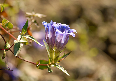 当地で希少種のリンドウが今年も何とか咲き出した。 土手に咲くこのリンドウ、ほとんどがまっすぐ上に伸びるのではなく斜面に沿って這うように生え、先端付近で花が上向きに咲いている。中には花が地面から直接出ているように見えるのもある。 逆光で真ん中の雌しべが花冠に影絵のように映っている。