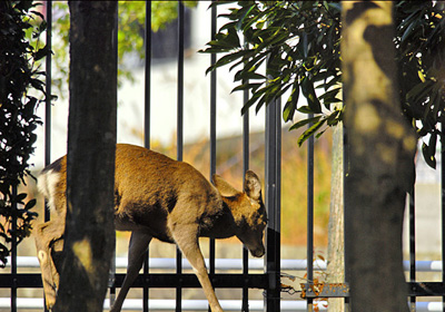 団地の端にある小さな公園に差し掛かると2頭の仔鹿に出くわした。この公園の片方は雑木林になっている斜面に接していて、その境に金属製の格子状の塀がコの字型に巡らしてある。 一頭は直ぐ逃げたが残った一頭はコの字型の柵の中に入ったまま逃げられず、塀の隙間に頭を突っ込んでそこから逃げようとするのだが、如何せん幅が十数センチしかないので抜けらず、他のところで何回も試みるがどうしようもない。 あまりにも可愛そうなので雑木林の方に誘導するために仔鹿の後を追っかけるようにしてして逃がしてやる。