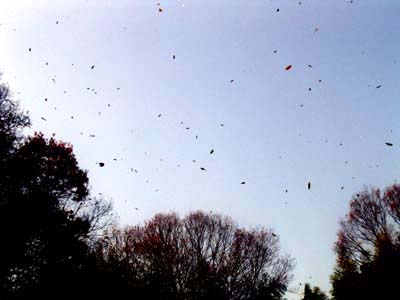 時折強く吹く北風に、コナラ、クヌギの梢から一斉に枯葉が舞い上がりました。 キラキラ、クルクル、ハラハラ、ヒラヒラ・・・・。 木の葉が今年の役目を果たし終えて土に還る旅の はじまりです。