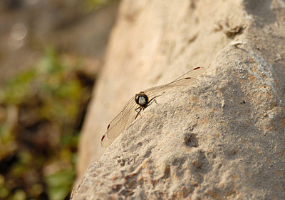 夏から秋にかけてヒメアカネが活発に活動していた休耕田で、12月のこの日は石の上で日向ぼっこ。 身体はもちろん太陽に垂直に当るような場所だが、石や板の上ではさらに輻射熱も浴びられるのでこんな場所に好んでとまっている。