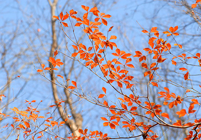 モミジの葉がほとんど落ちてしまったこのモミジ林では、ドウダンツツジの紅葉が日に映えて輝いている。 背景の葉の落ちた樹々はほとんどがモミジの樹。