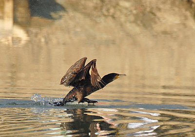 カワウのような大きな水鳥は、水面から飛立つには飛行機のように助走して揚力を上げる必要がある。 見ていると水面上を足を交互に動かして、水を蹴って必死に走っているのが分かる。