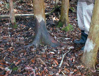 面白い発見をしましたので、報告します。 イノシイ年のはじまりで、ちょうどヌタ場とコスリ棒が見られました。 調査日は1月3日で、場所は茨木市と高槻市の境目の安威川上流です。前日の午 前中に雨が降ったので早朝のコスリ痕で、地面にも水がかっていました。 シカも常時使っています。