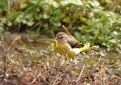 数日の雨で水溜りとなった休耕田で一羽のキセキレイが盛んに採食していた。一時間前にもこのキセキレイが同じところで蜂の幼虫のようなものを捕え食べていたが今度は青虫(幼虫)を捕えたようだ。
