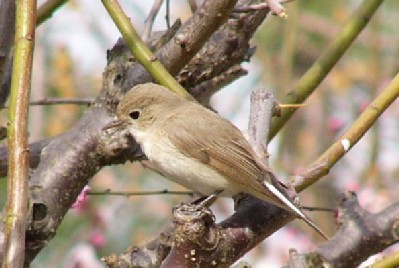 珍しい冬鳥のオジロビタキが1羽、1月頃から伊丹市の緑ヶ丘公園に滞在していま す。 梅林の中をメジロたちに混じって元気に飛び回っています。あまり目立たないメスで すが、丸い目が可愛く、尾羽の外側の白色が鮮やかで、愛嬌を振りまいています。