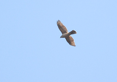 舞いながら山の方に向かうタカ。ハイタカに似ていたがそれより大きい。写真を拡大して見ると、お腹の部分が縦斑になっている事や他の特徴からオオタカの幼鳥のようだ。