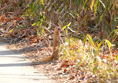 山道を歩いていると前方50mほどのところを横切るイタチに遭う。イタチもこちらの足音に気が付いたのか辺りを見回している。 しかしこちらがじっとしていたものだからこちらの存在が分からなかったのか、やにわに立ち上がり周りを見回し始めた。それでやっとこちらの存在が分かったようで慌てて右側の茂みに逃げ込んで行った。