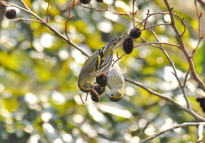 前日マヒワがいた場所から近いところのヤシャブシの木に10羽ほどのマヒワの群が果実を食べていた。今までマヒワを遠くからしか見ていなかったので大きさが判らなかったがこの日かなり近いところから見たのでマヒワがメジロほどの小さい鳥である事が実感できた。