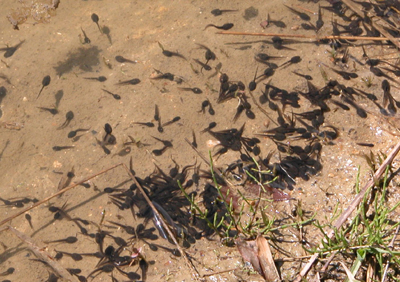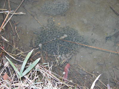 2月21日にはまだ卵塊のなかでうごめいていたニホンアカガエルの幼生は、2週間後には完全に孵化し、岸辺にあつまって活発に動き回っていた。