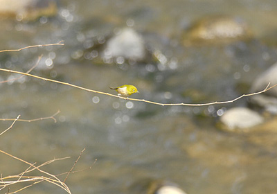 橋から渓流を眺めていると渓流の上に張り出している小枝にメジロがとまり冬芽を食べていた。 メジロは枝先の冬芽を求めて前に進むが、こんな細い枝ではいくら体重が軽いメジロといえども枝は下へ大きくしなってしまう。 もちろん鳥なので落下はしないが飛んで避難し、こりずに再び枝にとまり冬芽を求めていた。