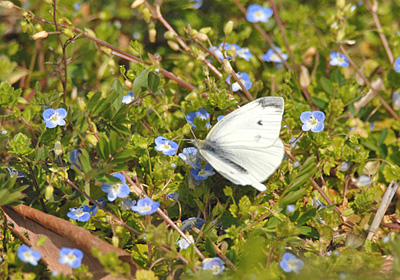 モンシロチョウの当地での過去の初見日を見ると、2002〜2006年の5年間でそれぞれ3/14、3/19、3/13、3/29、3/25で、今年の初見日は3/10でこのいずれよりも早い。 ルリシジミの初見も例年3月中旬から下旬だが、今年は3/4と早くなっている。