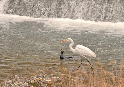 余野川にはあまり姿を見せないカワウがやって来て、堰のところにある深みで魚を捕っていた。するとそこにダイサギがやって来てカワウに近づき魚を捕りだす。 この行動いつも見るが、カワウがいるところは魚が多くいると知ってやって来るのか、それともカワウが潜って魚を捕るときに周辺に逃げる魚を狙っているのか、それとも他に理由があるのか、面白い行動である。