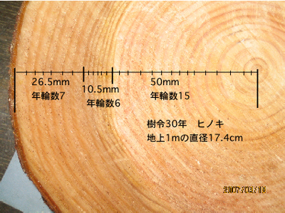 太子町で活動する「間伐隊」は、約30年生のヒノキと約40年生のスギ・ヒノキを間伐しています。先日間伐した約30年生のヒノキの年輪構成は写真のように、植林後15年間はよく育ちましたが、密植のために、その後の6年間は樹冠が競り合って成長が遅れています。7年前の間伐によって再び成長が進みました。年輪間隔はその状況を正直に示しています。