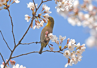 この日桜は5〜7分咲きでまだ満開ではないが快晴で青空をバックに桜が映えて見えていた。あちこちでメジロが吸蜜に来ており、大きなヒヨドリも混じって吸蜜している。メジロの吸蜜姿を見ていると時にアクロバットのような格好で吸蜜している事がありよくもこんな格好が出来るものだと感心してしまう。
