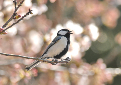 シジュウカラが若葉が出だしたモミジの樹と隣の花をつけたサクラの樹の間を行き来して採食している。見ていると枝先などにいる小さな幼虫を採食しているようで時々雄が「ツツピー ツツピー」とさえずっている。採食中のこのさえずりは何の意味なのか判らないがこれも縄張宣言のさえずりなのだろうか。