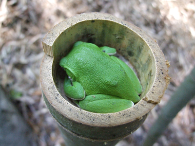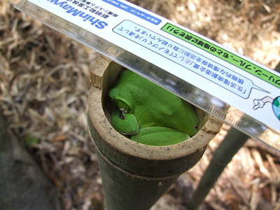 5月4日、妙見里山倶楽部活動地の竹藪で、「かぐや姫」に」出会う。 幸運の女神か?竹の切り株の中でぐっすり眠っておりました。 もう少しすると水溜まりの上の枝に、卵塊が見られる様になります(モリアオガエル:雌)