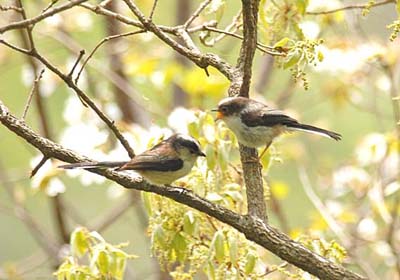 近くの樹でセンダイムシクイの鳴き声がするので姿を探していたところ、どこからともなくエナガの群がやって来て鳴き声で騒がしくなった。見ると巣立ち間もない幼鳥が混じる親子の群で10羽以上の幼鳥がいる。眼の周りが赤く、嘴の基部が黄色くなっていて幼鳥の特徴が見られ、親鳥から餌をもらっているものも見られた。