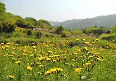 この時期畦や土手は黄色い草花で埋め尽くされる。 タンポポ、キンポウゲ、ノゲシ、ハハコグサ、オヘビイチゴ、キジムシロ、カタバミ、イヌガラシ、オオジシバリ、オニタビラコ、コオニタビラコ、ニガナなど、そしてコウゾリナも休耕田で群生。