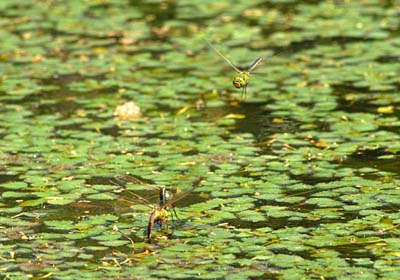 ため池はすっかりヒシの葉に覆われ、その上をギンヤンマがパトロール飛行。 飛行中のギンヤンマが時々水面上でとまる事があるので、よく見ると雌雄連結のギンヤンマが産卵の最中。飛行中のギンヤンマがこのペアーに時々攻撃をかけている。 そんな邪魔が入るにもかかわらず産卵は延々30分以上続いていた。