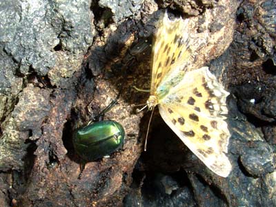 今年は特にはげしくマイマイガ幼虫が往来していました。 それが終わったクヌギの幹に、待ちに待った櫟酒場が 開設されました。 オオスズメバチの居ない間はキタテハ(夏型)とアオカナブンが ゆっくりと席に着いています。常連のヨツボシオオキスイ、 ヨツボシケシキスイのコンビはもうすっかりいい気分に なっているようです。