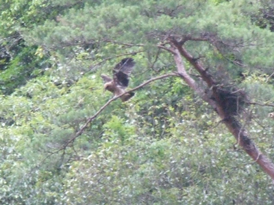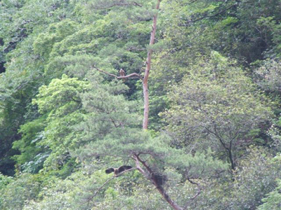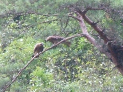6月23日:武田尾でのトビ親子の写真です。(上): 餌を与える親(右)と子(左)(中): 餌を与えると巣の上の松の監視場所で休む。子は羽ばたきの練習(下): 子の羽ばたきの練習 今年は、新しく巣をつくり、一羽の幼鳥を確認。巣立ちはいつ頃になるのか?