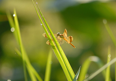 早朝雲ひとつない空模様で、朝日が顔にまともに照りつけ暑い。そんな中、数日前に羽化を目撃したミヤマアカネの水域付近で、4頭の成虫が草むらで休息をしていた。 朝日で朝露が輝き、葉にはミヤマアカネの翅が映っている。