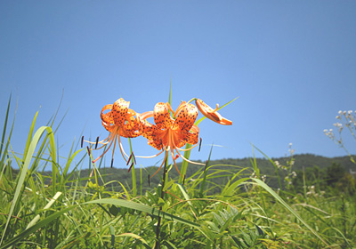 放置された畑と土手、畦は草ぼうぼうでその中からオニユリが突出したような格好で花が咲いている。 最近では外来種のタカサゴユリがはびこり、この地でも夏から秋にかけて白い花を咲かせているのが見られるが、オニユリはまだ健在である。