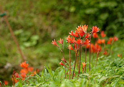 しばらく来なかった場所にいつの間にかキツネノカミソリが咲いていた。花の色は橙色に近い黄赤色だが株によって色はバラエティーに富んでいる。 花被片先端が白くなっているのも混じっていて色も微妙に違っている。