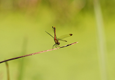 赤トンボのリスアカネが繁殖時期に入り、溜池の淵では産卵が盛んになってきた。 繁殖に向け雄は少しでも目立つ場所に陣取るがそんな場所は真夏では暑すぎる。そこで少しでも暑さを避けるため腹部を太陽の方向に向けるポーズを取る。