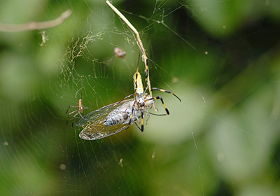 この日ミンミンゼミとツクツクボウシが鳴き比べをしているかのように騒がしく鳴いていた。そんな中今まさに蜘蛛に捕えられたツクツクボウシ。 蜘蛛はジョロウグモのようでセミの胸部辺りから体液を吸っている。 左側の見える小さい蜘蛛は雄と思われ獲物の近くまで来るのだが採食に加われない。はたして雌が食べ終わった後おこぼれにあずかれるのだろうか。