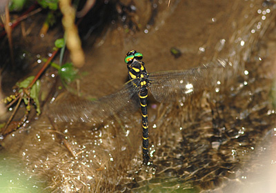 畦道に沿った細い溝にオニヤンマが飛んできて産卵を始めた。 この溝、コンクリート製なのだが底に草の根が密集しているところがあり、そこに卵を産みつけている。 雌は体をほぼ垂直の姿勢で腹部先端にある細長い産卵管をリズミカルに上下させて産み付けていた。