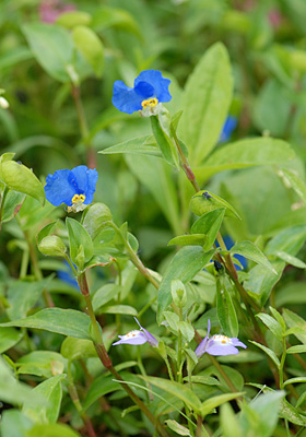 色の濃いツユクサが生えている傍に春の草花ムラサキサギゴケ(写真下側)が咲いていた。 春の草花が秋咲いているのは時々目にするが、ムラサキサギゴケが9月に花を咲かせているのを見るのは初めて。ツユクサに混じって咲いているのを見ると奇異に感じる。