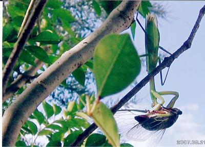 里山を開発した住宅地なので、台所にいても虫たちの生死のドラマをよく見ます。この写真は私もこのカマキリのように枝にぶら下がって必死で写しました。
