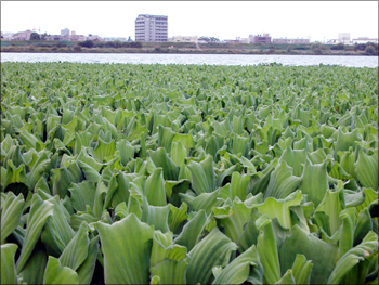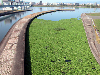 右上:毛馬閘門に流れついた大量のボタンウキクサ(2007.10.28.)